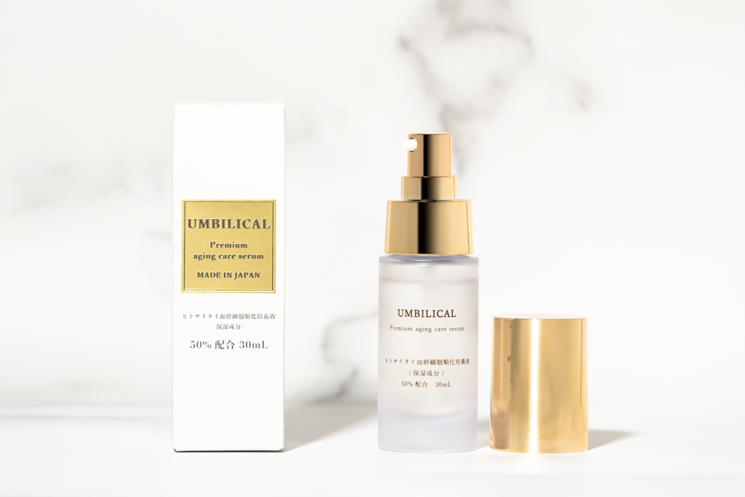 UMBILICAL(アンビリカル)は、先進的なエイジングケア(※1)が体感できるMade in JAPANのユニセックス美容ブランド。プレミアムエイジングケアセラムはヒトサイタイ血幹細胞順化培養液(※2)を50%と高濃度配合した美容液です。
